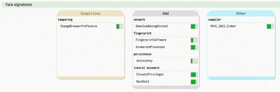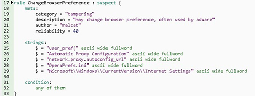 Figure 3 illustrates some rules for analyzing a suspicious binary sample. It can be verified that this analyzed sample contains sensitive patterns involving changing browser configurations, downloading content from the internet, elevating privileges, and enumerating processes.