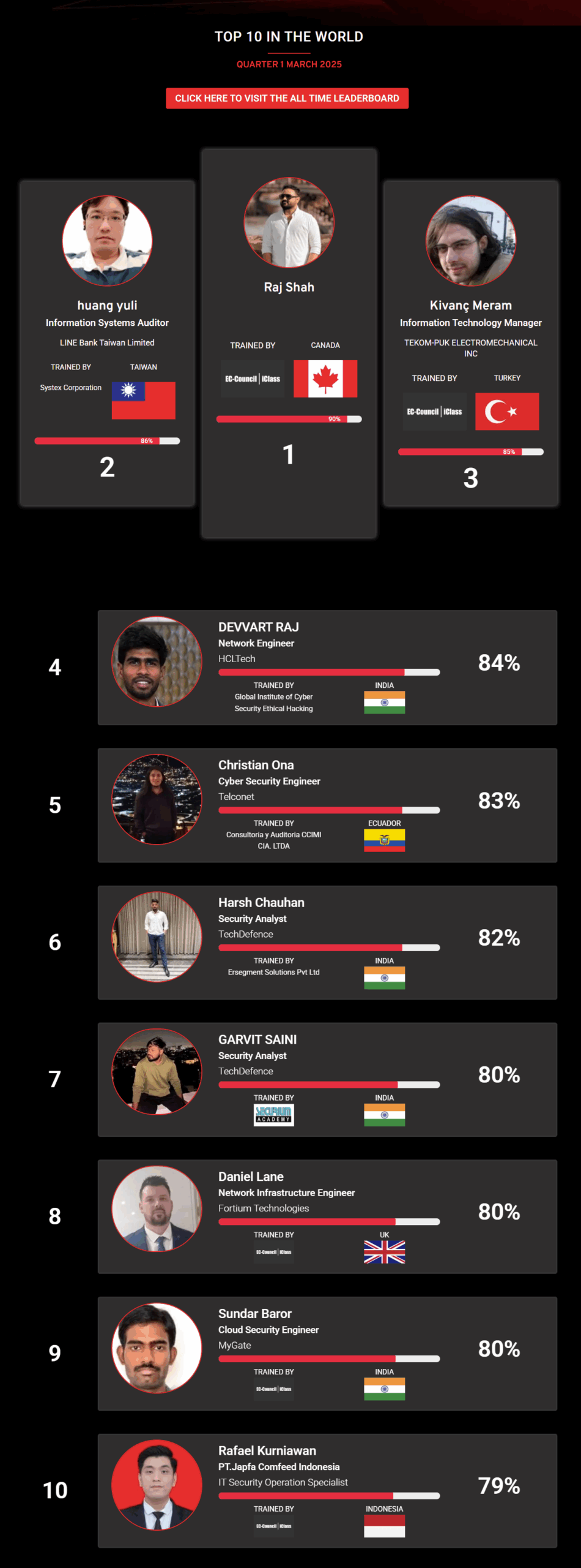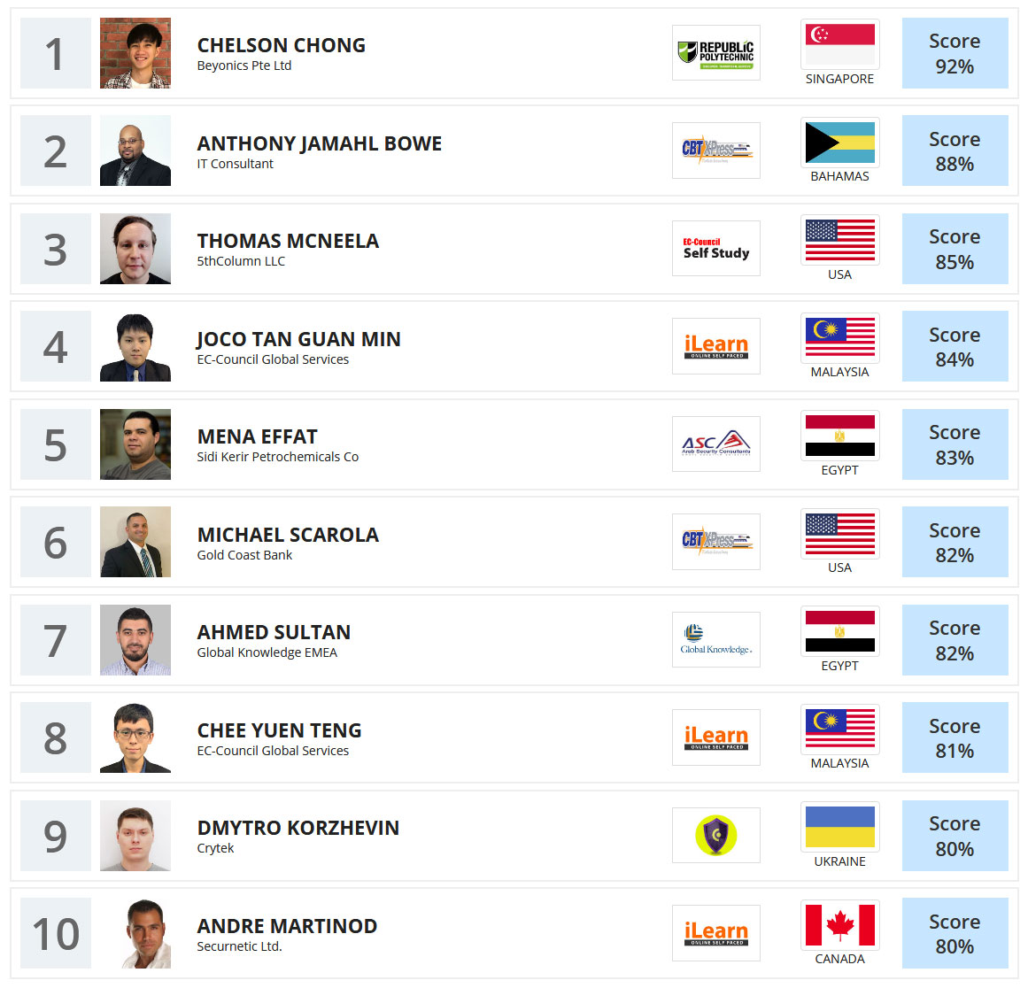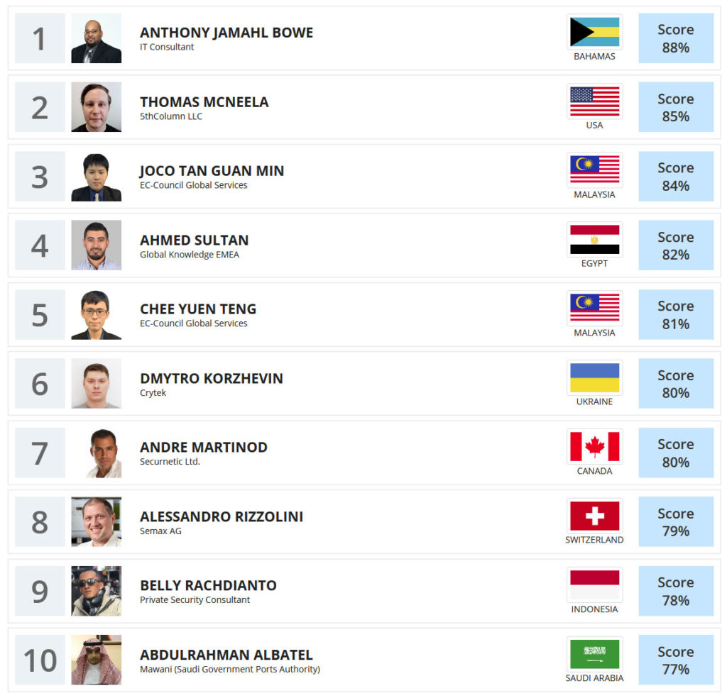 (Note: Placement on the CEH Master Leaderboard has no bearing on certification status, pass or fail, candidates appearing on the leaderboard achieved a combination of the highest scores possible in the fastest time possible in comparison to other CEH Masters appearing on the Leaderboard)