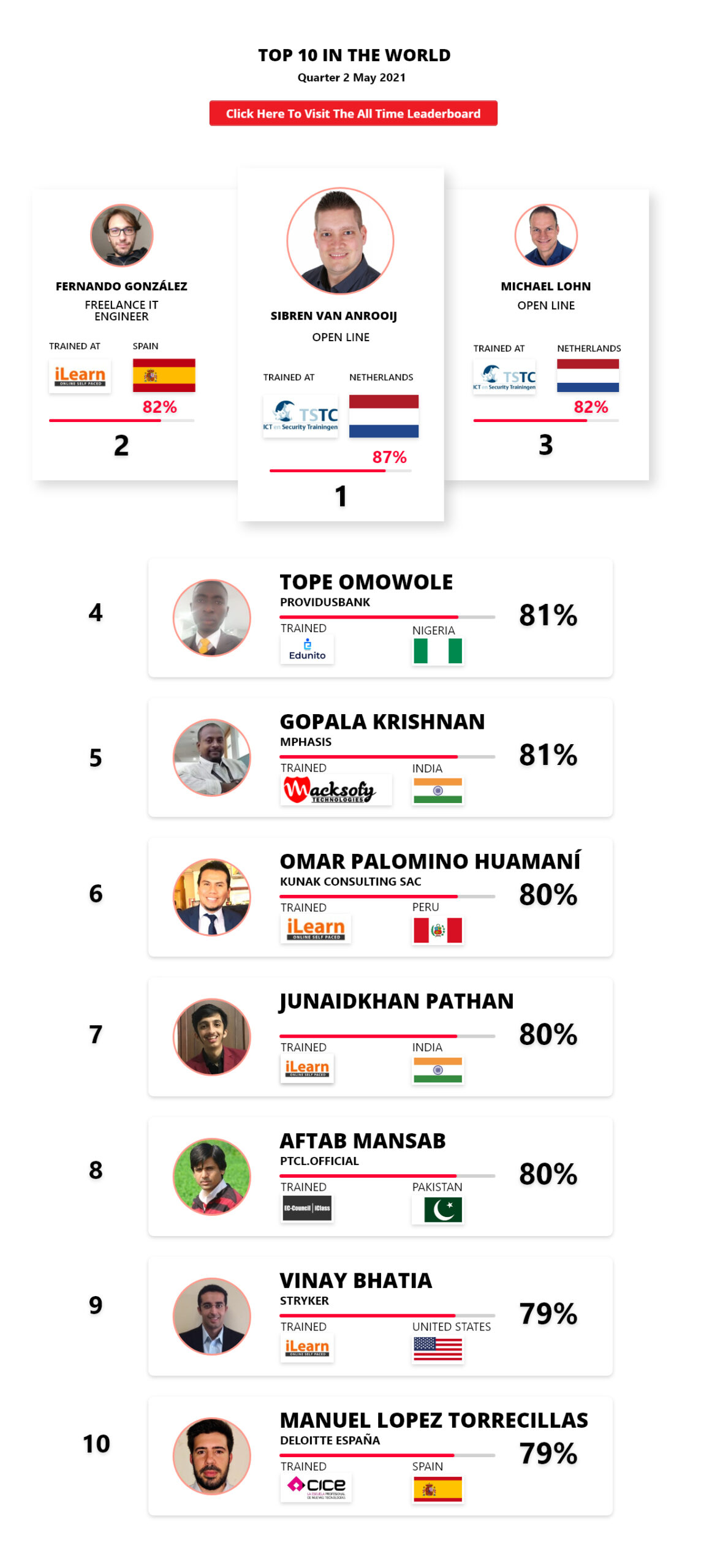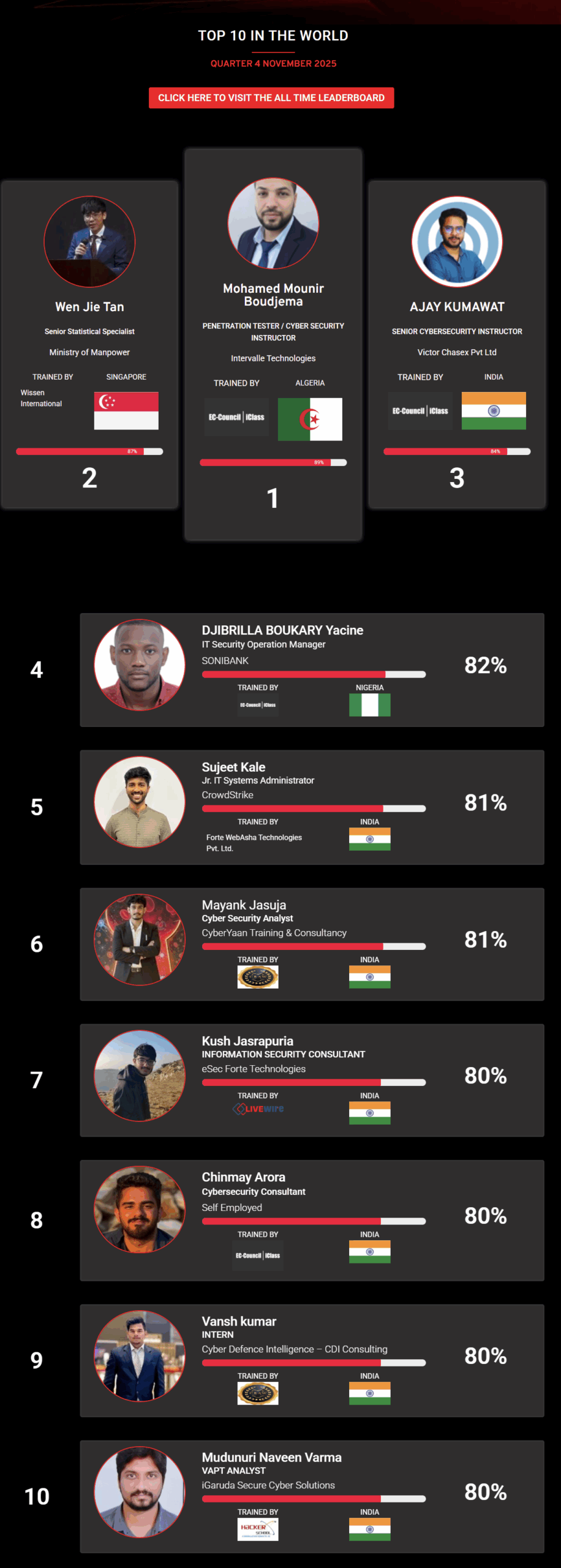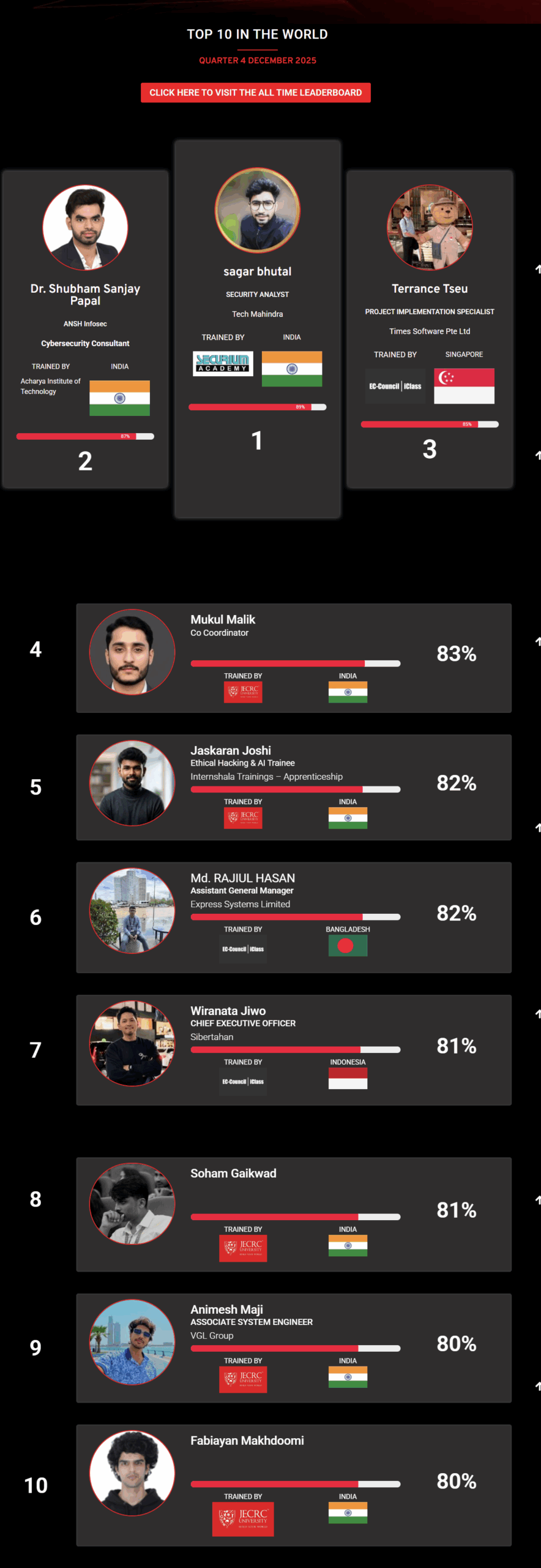 (Note: Placement on the CEH Master Leaderboard has no bearing on certification status, pass or fail, candidates appearing on the leaderboard achieved a combination of the highest scores possible in the fastest time possible in comparison to other CEH Masters appearing on the Leaderboard)